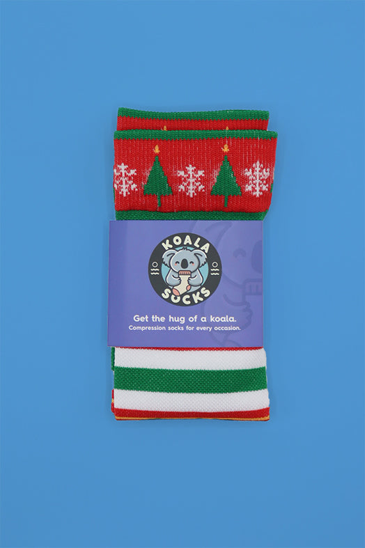 Our Christmas Elf Compressions Sock sport a classic design for the festive season, with green, red and white stripes all the way down. The visible collar of Christmas trees and snowflakes finishes the design.