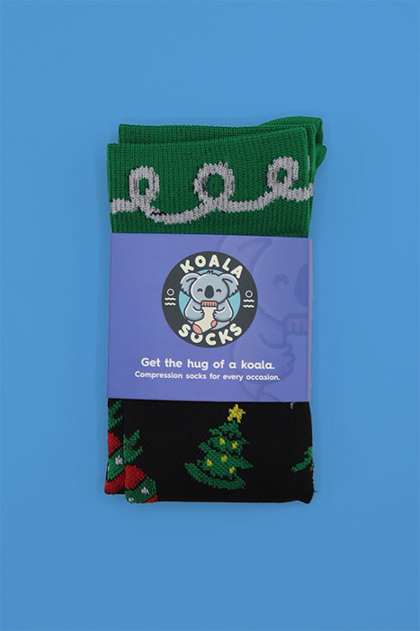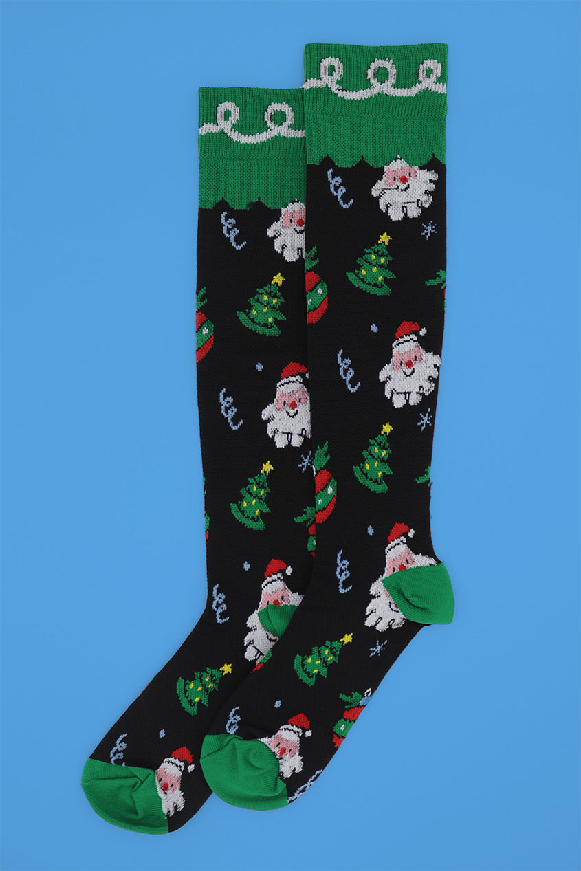 Two of the seasons most iconic features combine to make our Christmas Tree & Santa Compression Socks, the perfect gift for friends or family this year. Adorable Santa faces, cute Christmas trees and even festive baubles and other graphics are found throughout the design, with green topping and tailing the socks.